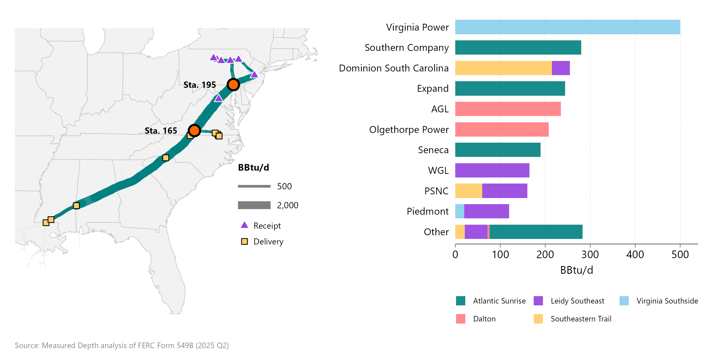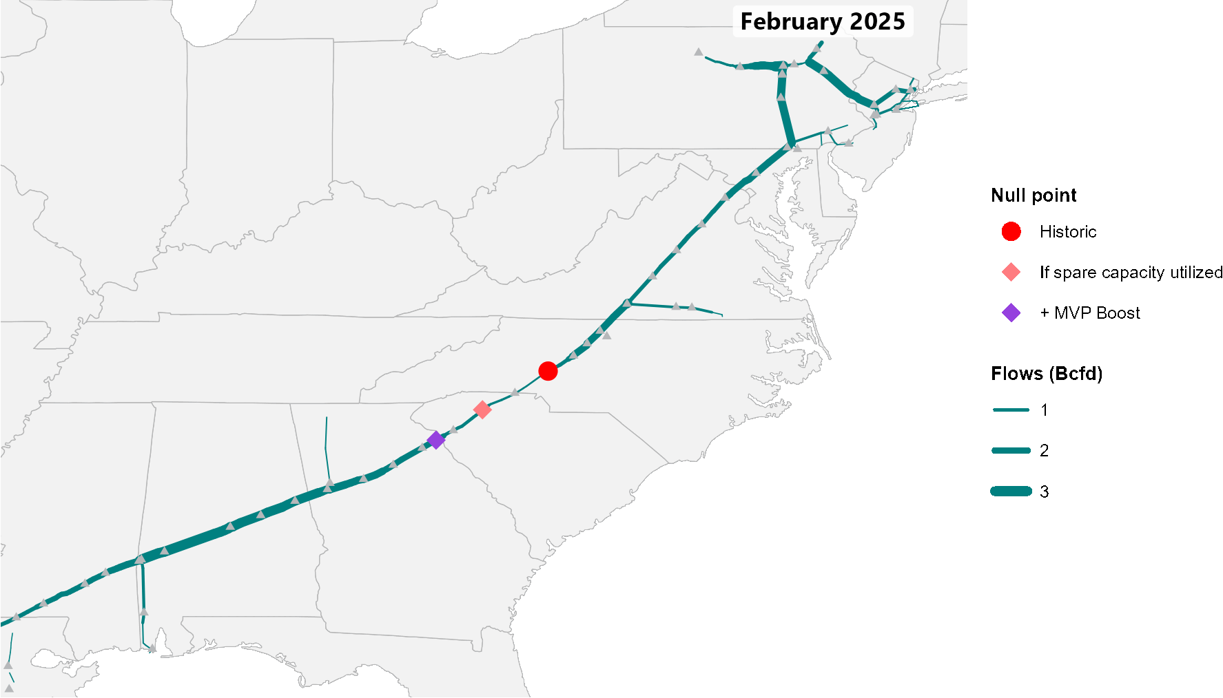 In peak-demand months, when the null point was already north of Duke’s territory, SSE supplies alone would hardly shift it at all. But in a shoulder month, an additional ~1.6 Bcfd could create a new constraint at Station 85. Demand growth in the Southeast means such a constraint will be short-lived if it materializes. But Duke itself seems to acknowledge this risk, as the primary delivery point for much of its capacity is at Station 85, not North Carolina. This null point analysis shows that compressor station reversals as far south as Georgia were needed for SSE shippers to capture the value of unused capacity in the months or years before they fully grow into the new capacity.