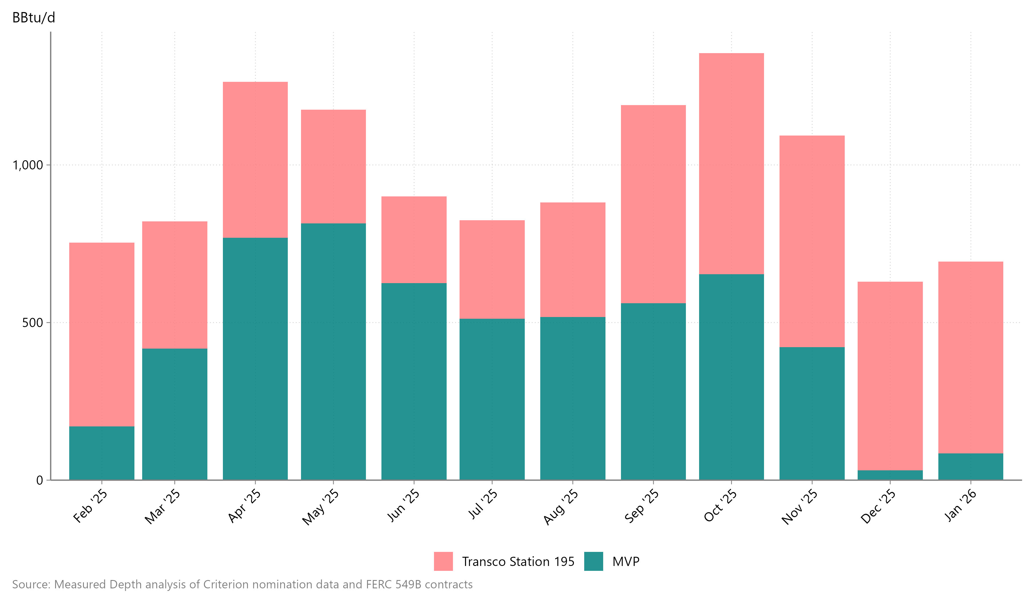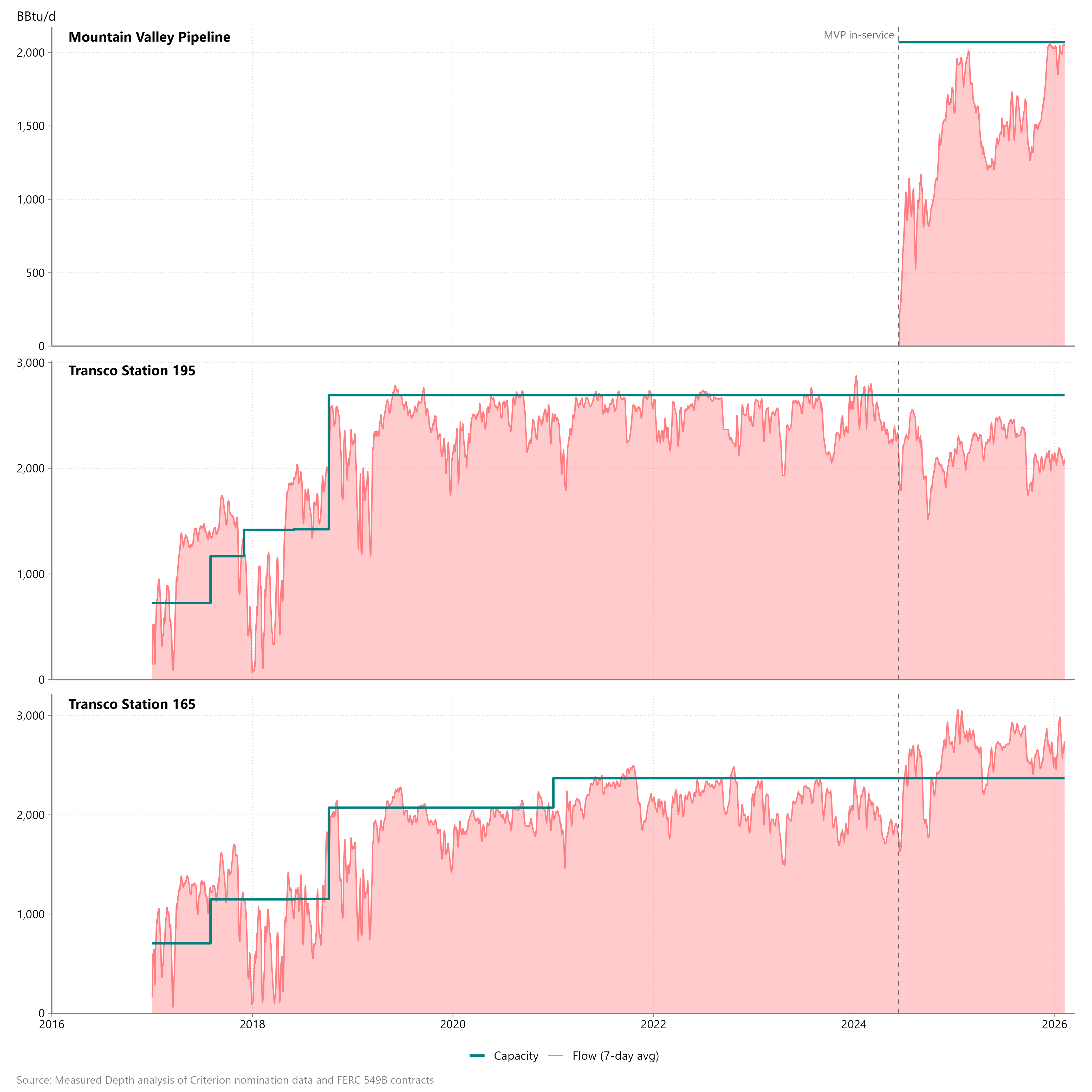 A challenging commercial paradigm for new pipeline development has thus far precluded FID on Texas Gas’s proposed 2 Bcfd Borealis Project. But the one class of buyers with the right institutional structure to backstop new takeaway — utilities with a rate base — is doing exactly that. They are the shippers behind EQT’s MVP Boost expansion, which will add 600 BBtu/d and targets a 2028 in-service date. And another Southeast-utility-backed project already has its FERC certificate and will improve market access for Appalachian gas even sooner. Transco’s Southeast Supply Enhancement project adds ~1.6 TBtu/d of capacity from Station 165 and its nearby interconnect with Mountain Valley Pipeline to various Southeast delivery markets.