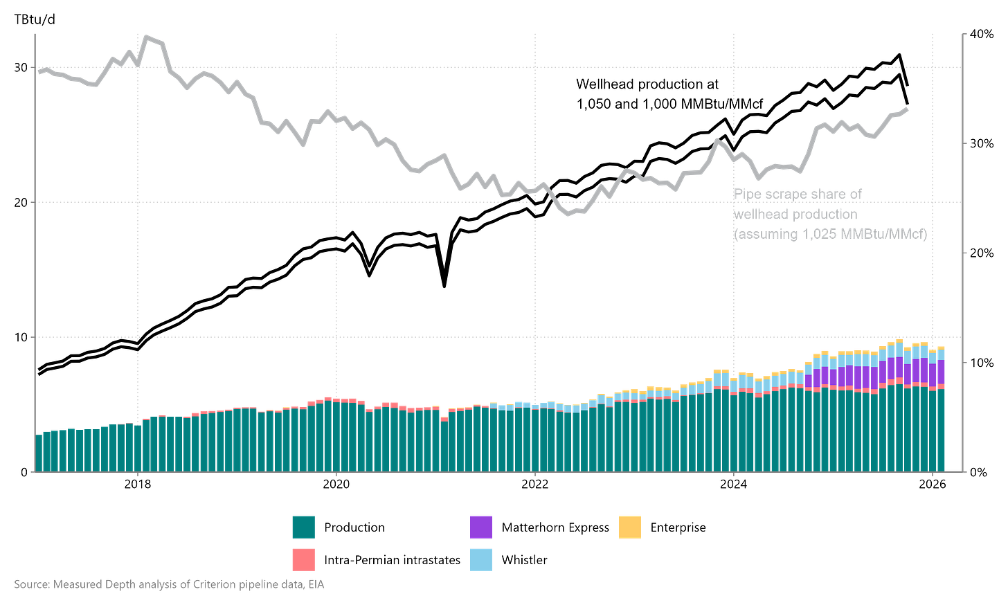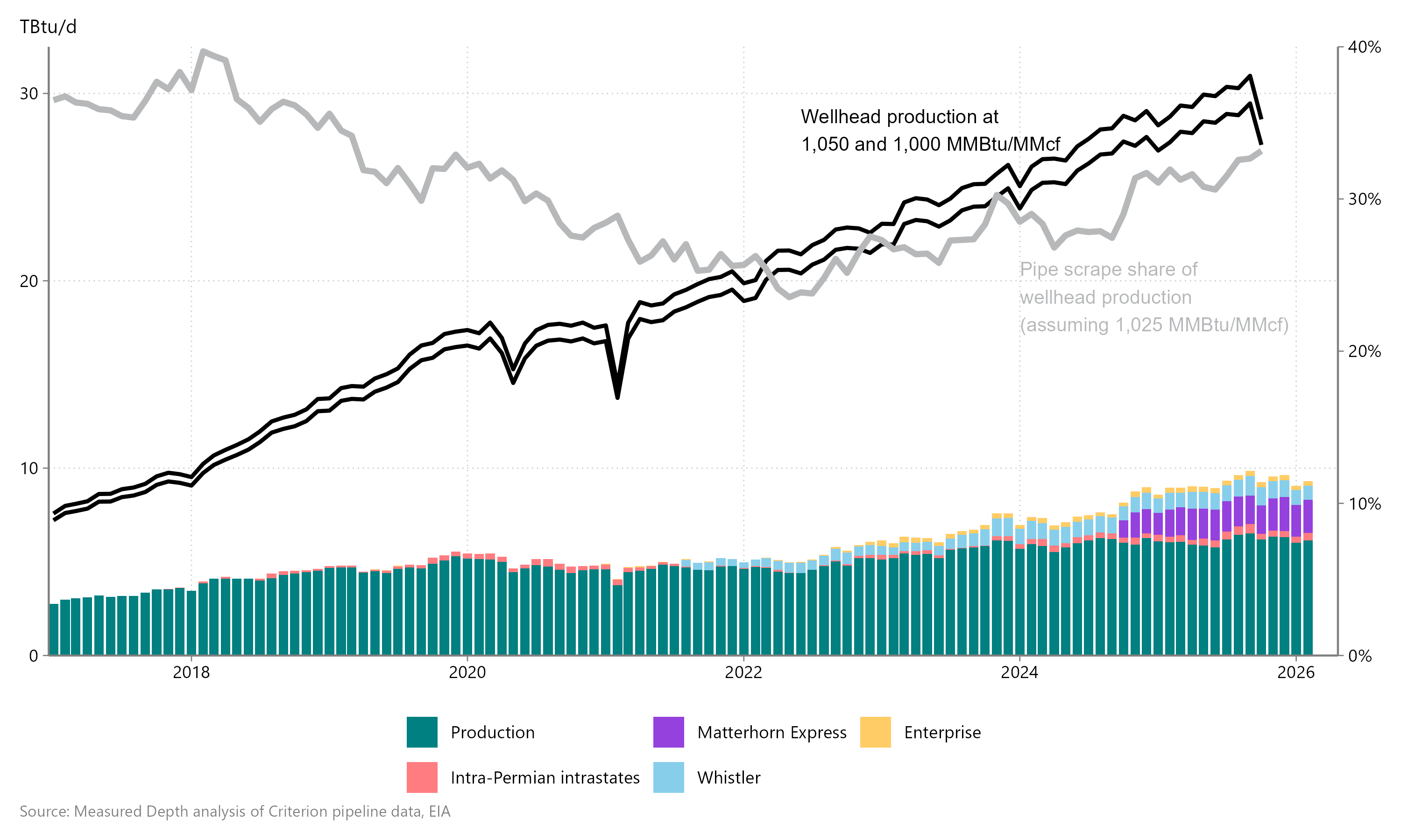 Figure 6 | Permian wellhead gas production and pipeline scrapes
