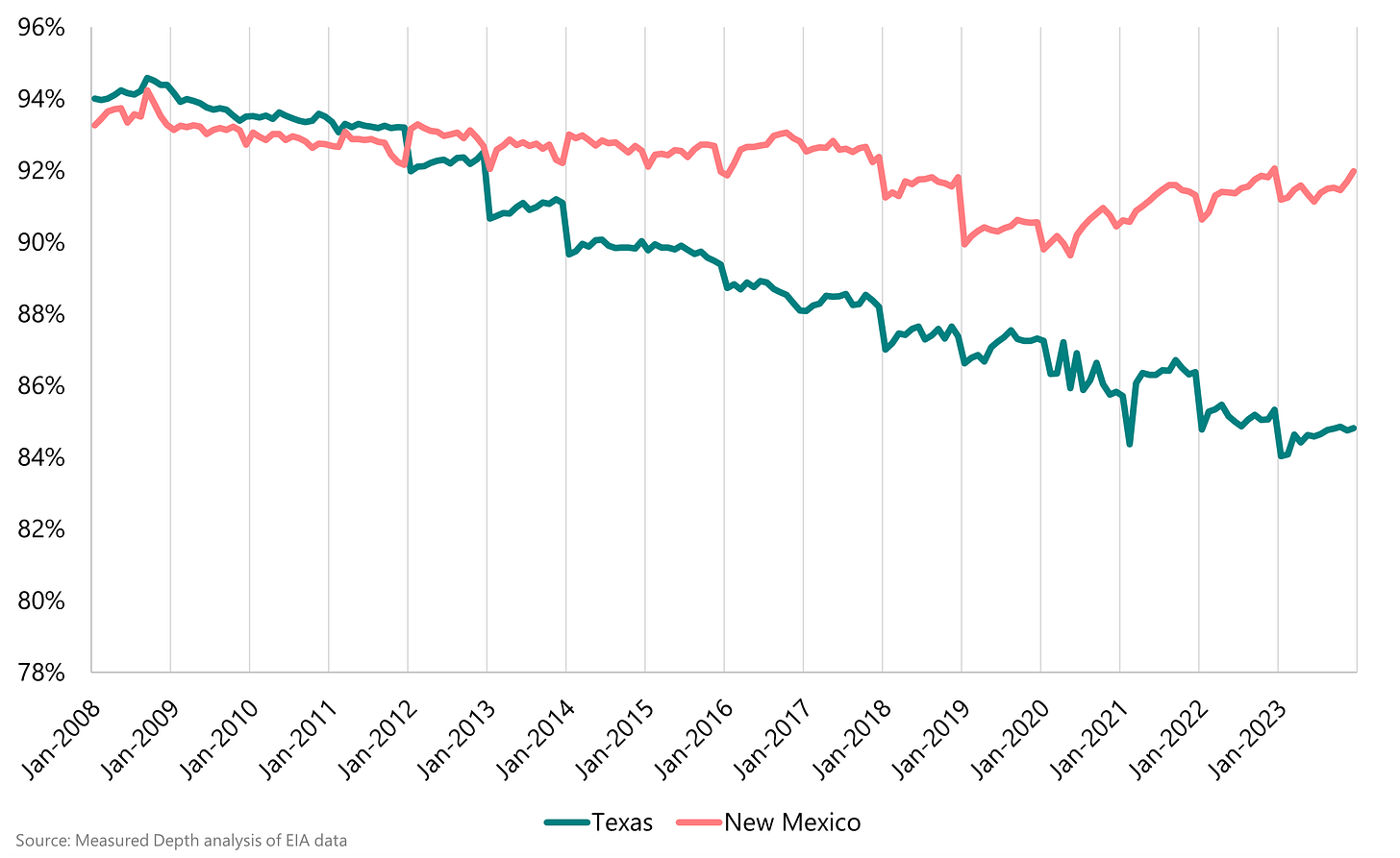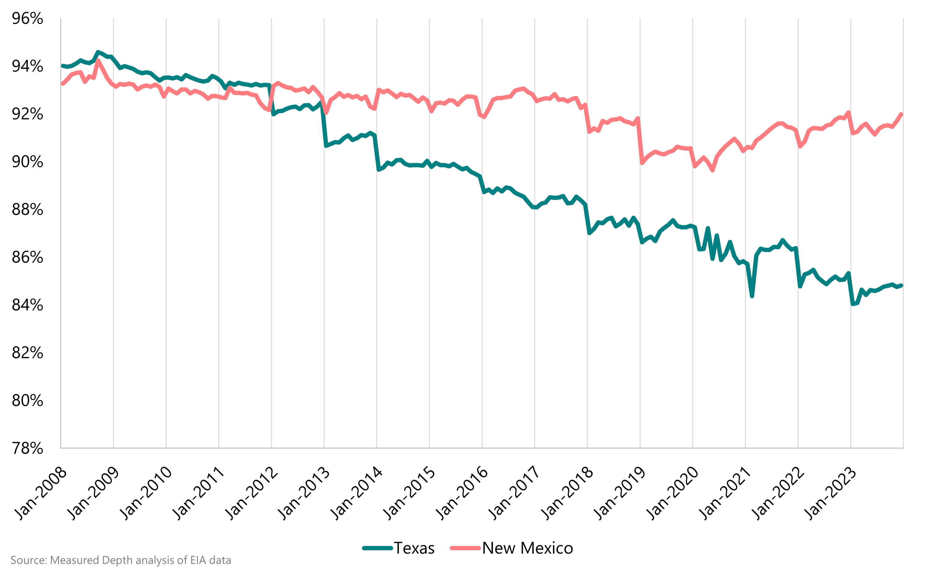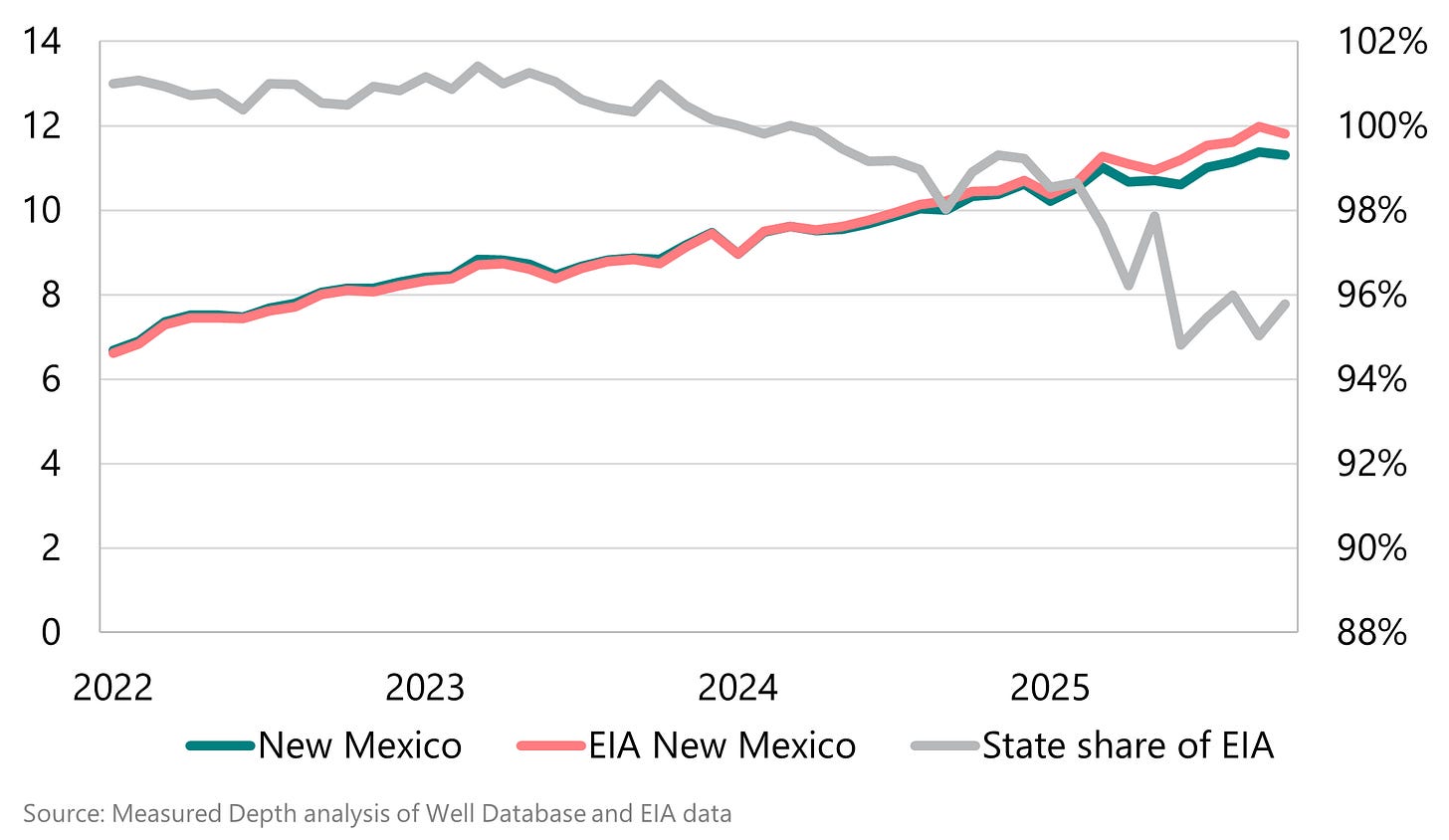 In New Mexico, the ratio has fallen much more slowly, not because the wellhead share hasn’t also declined but because a significant share of New Mexico Permian production is processed in Texas, and the EIA’s estimates are driven by where the gas is processed.