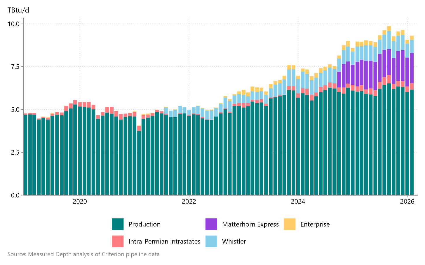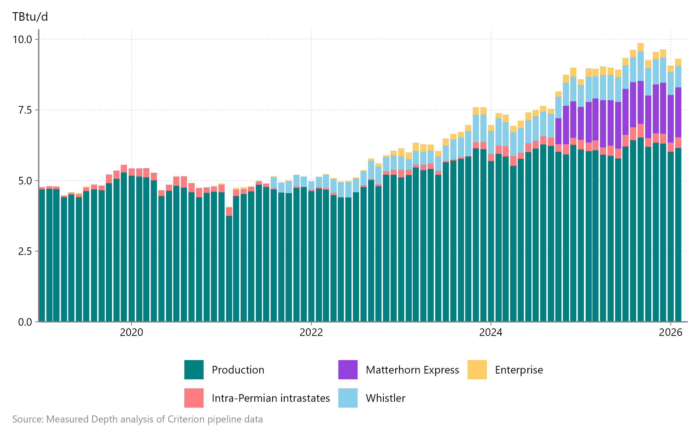 El Paso, TransWestern, NNG, and NGPL typically move1 ~6.5 TBtu/d, from a combination of direct connections to gathering systems and processing plants (shown in teal) and receipts from intrastate pipelines within the Permian (in pink). Since the final Matterhorn Express compressor station came online, it (in purple) and Whistler (in light blue) usually move ~2.5 TBtu/d to south Texas. Interstate receipts from Enterprise typically total an additional ~0.3 TBtu/d.