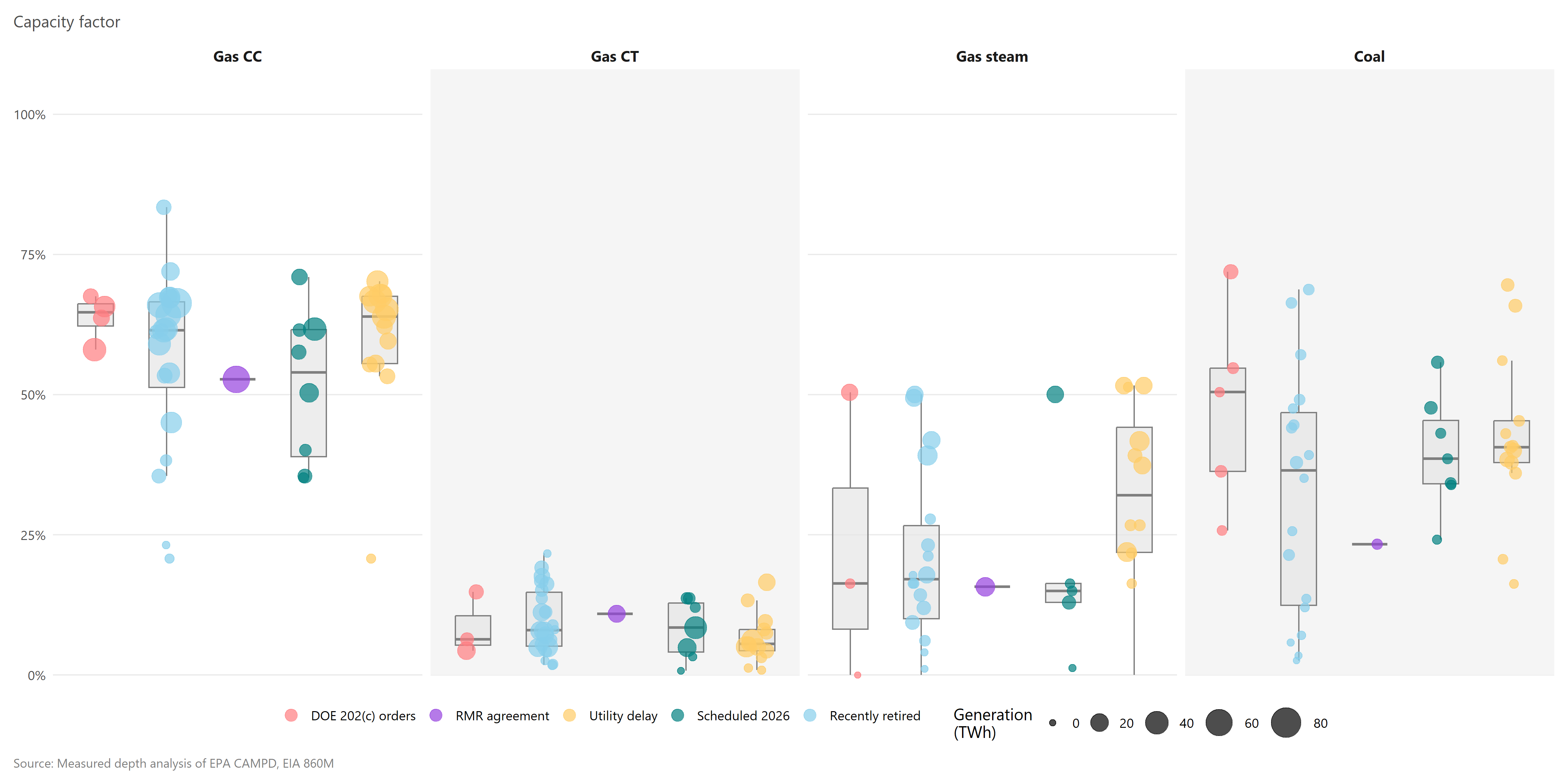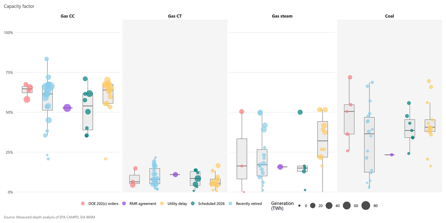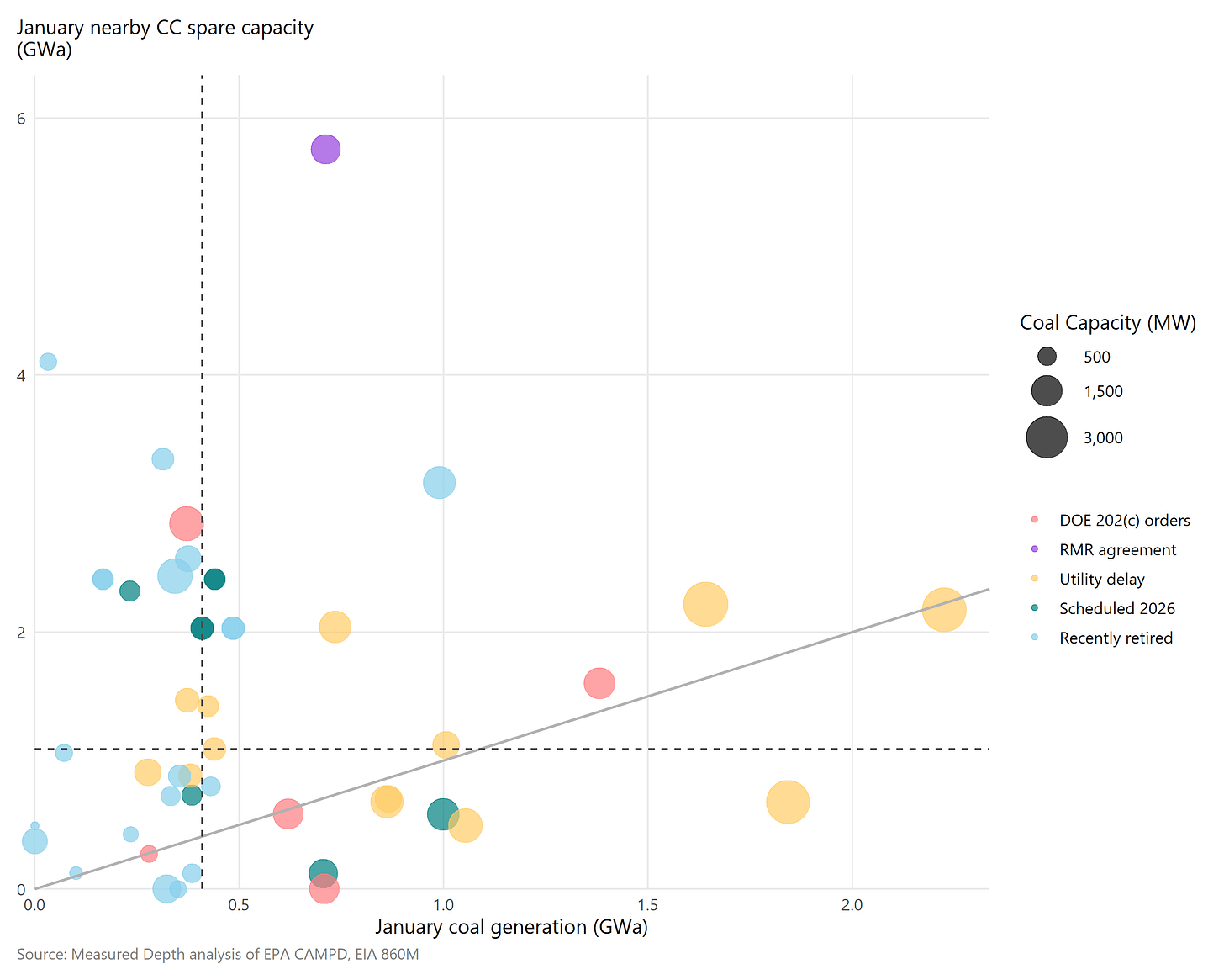 Furthermore, capacity factors indicate only whether spare capacity is available, not its magnitude. For example, a 30% utilized 500 MW CC cannot offset the generation from a 30% utilized 1,000 MW coal unit. In January, when these coal plants run hardest, only one DOE-delayed plant has materially more spare CC capacity available than the coal generation retiring. Plants where utilities have delayed retirements also feature tighter January CC availability. Some scheduled retirements in green also appear to be at risk unless new baseload capacity is added.