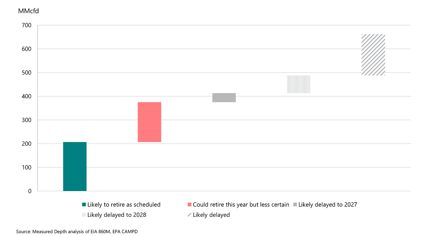 Altogether, I expect 3.0-5.2 GW of retirements in 2026, adding 200-400 MMcfd of gas demand. This compares with 7.3 GW in the most recent EIA 860M, including the DOE-delayed plants still listed as planned for 2025.