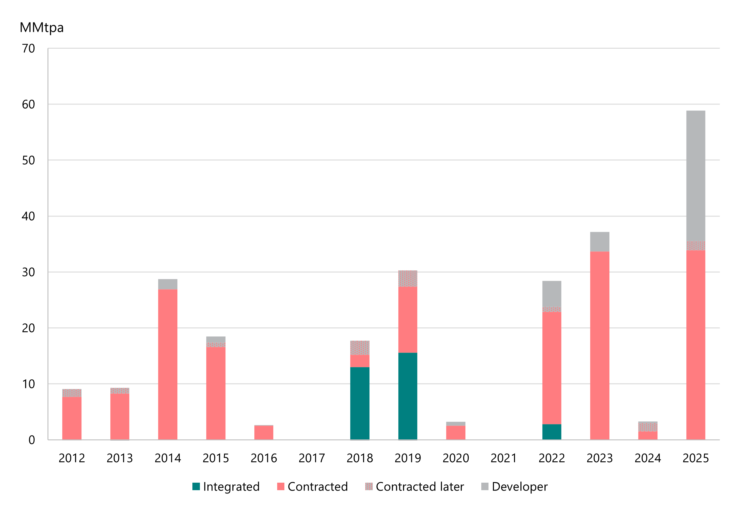 The defining feature of the 2025 LNG FID wave was not its size but its composition. Unlike in prior cycles, most of the capacity was not underwritten by end users locking in supply but by new players taking commercial exposure.